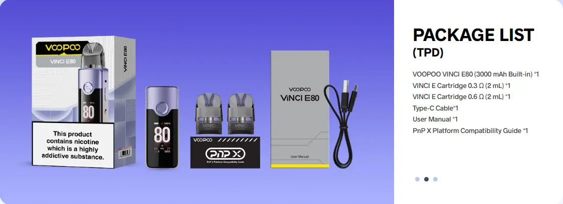 The Voopoo Vinci E80 provides outstanding versatility through broad coil compatibility, allowing you to choose from either an Empty Vinci PNP X Cartridge with the full range of PNP X Coils, or the Vinci E Cartridge with 0.3Ω or 0.6Ω integrated coil. While maintaining the streamlined form factor that made the Vinci Series successful, the 1.47-inch colour TFT display still presents detailed device information, this device does NOT use auto-draw and is button fire ONLY.
